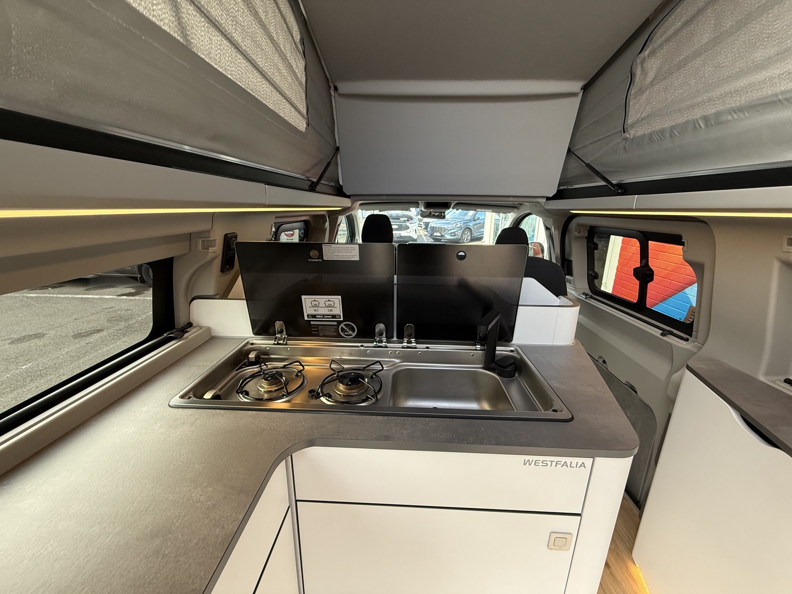 Aufstelldach in Wagenfarbe mit großen Fenstern & Moskitonetzen